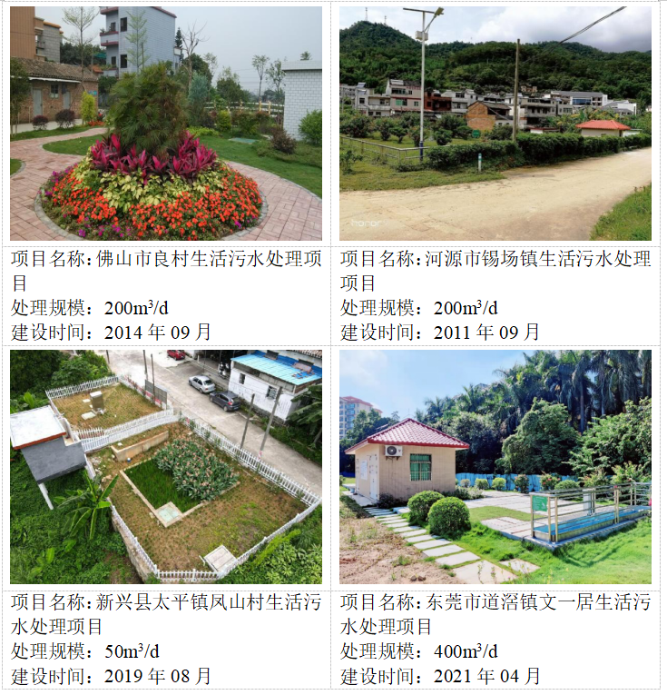 截至目前,在广东省范围内采用该技术已在佛山市顺德区了村镇良村、云浮市新兴县太平镇凤山村、东莞市道滘镇文一居和北辰、广州市白云区钟落潭镇长腰岭村等地建成数十座生活污水处理终端设施。处理设施皆埋于地下,处理站地表绿化后作为小公园或休闲广场,与当地村容村貌完美融合,受到了当地居民普遍认可。