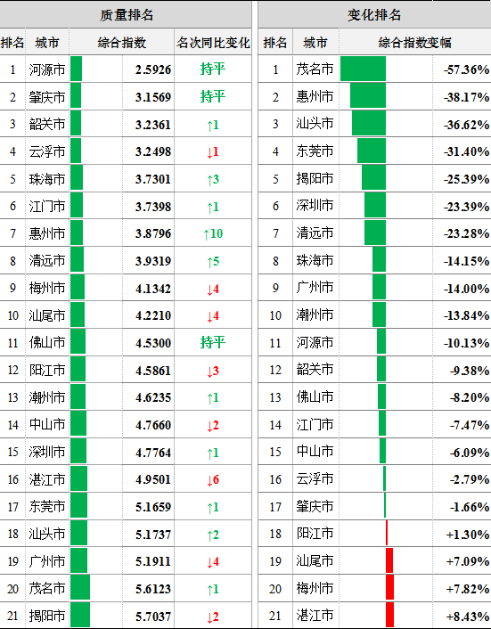 2020年1月,187个省考断面(包括168个地表水考核断面和19个入海河流国考断面)中,水质综合指数排名前三位为河源、肇庆、韶关市,后三位为揭阳、茂名、广州市。茂名、惠州、汕头等17市水环境质量同比有所改善,湛江、梅州、汕尾等4市同比有所变差。