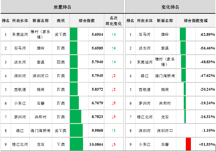 2020年1月,9个全面攻坚劣Ⅴ类国考断面中,水质综合指数排名前三位为东莞运河樟村(家乐福)、石马河旗岭、淡水河紫溪,后三位为榕江北河龙石、练江海门湾桥闸、茅洲河共和村。石马河旗岭、淡水河紫溪、东莞运河樟村(家乐福)等8个断面水质同比有所改善,小东江石碧1个断面同比有所变差。