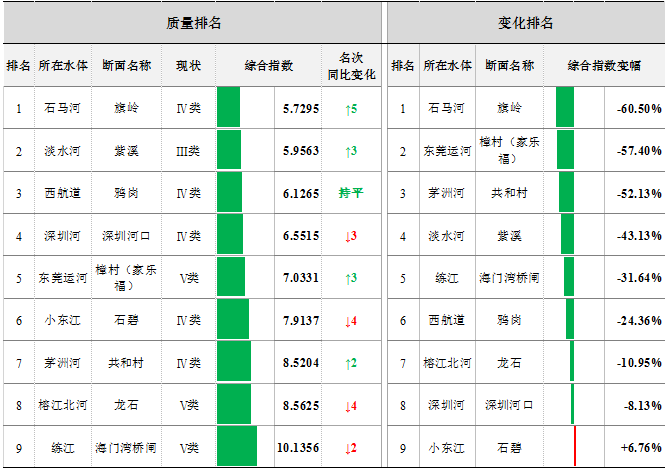 2020年1-5月,9个全面攻坚劣Ⅴ类国考断面中,水质综合指数排名前三位为石马河旗岭、淡水河紫溪、西航道鸦岗,后三位为练江海门湾桥闸、榕江北河龙石、茅洲河共和村。石马河旗岭、东莞运河樟村(家乐福)、茅洲河共和村等8个断面水质同比有所改善,小东江石碧1个断面同比有所变差。