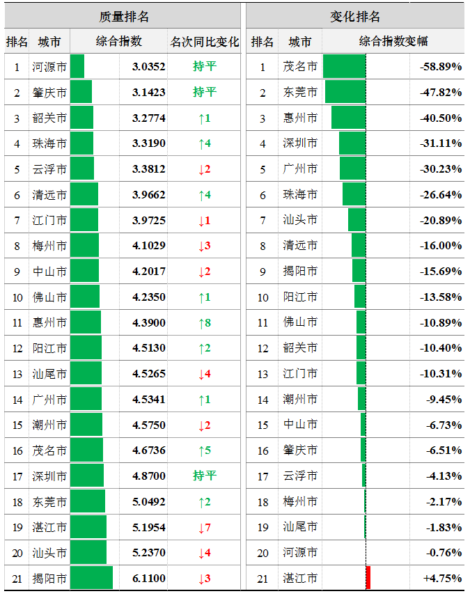 2020年1-5月,187个省考断面(包括168个地表水考核断面和19个入海河流国考断面)中,水质综合指数排名前三位为河源、肇庆、韶关市,后三位为揭阳、汕头、湛江市。茂名、东莞、惠州等20市水环境质量同比有所改善,湛江市同比有所变差。