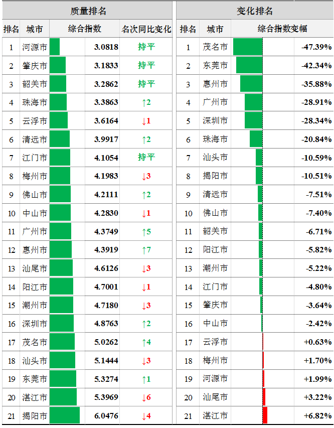 2020年1-8月,187个省考断面(包括168个地表水考核断面和19个入海河流国考断面)中,水质综合指数排名前三位为河源、肇庆、韶关市,后三位为揭阳、湛江、东莞市。茂名、东莞、惠州等16市水环境质量同比有所改善,湛江、汕尾、河源等5市同比有所变差。