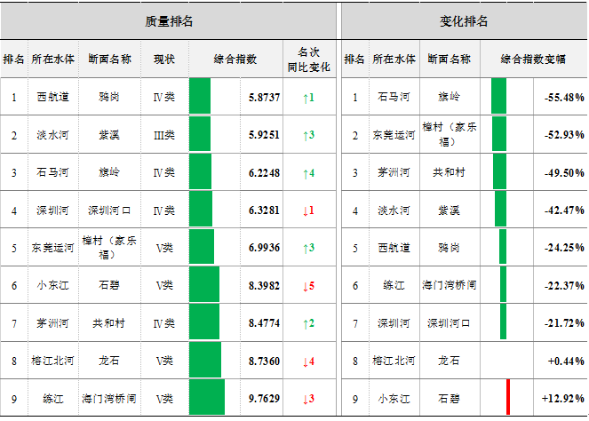 2020年1-8月,9个全面攻坚劣Ⅴ类国考断面中,水质综合指数排名前三位为西航道鸦岗、淡水河紫溪、石马河旗岭,后三位为练江海门湾桥闸、榕江北河龙石、茅洲河共和村。石马河旗岭、东莞运河樟村(家乐福)、茅洲河共和村等7个断面水质同比有所改善,小东江石碧、榕江北河龙石2个断面同比有所变差。