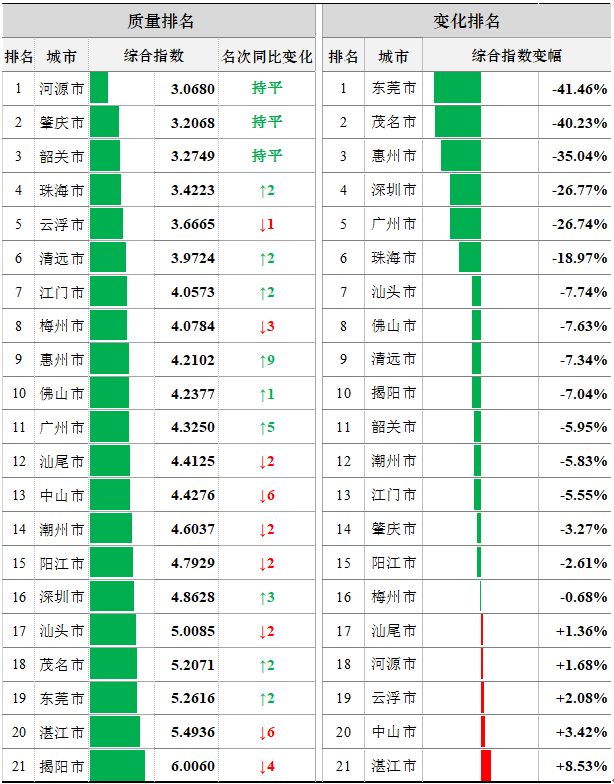 2020年1-10月,187个省考断面(包括168个地表水考核断面和19个入海河流国考断面)中,水质综合指数排名前三位为河源、肇庆、韶关市,后三位为揭阳、湛江、东莞市。东莞、茂名、惠州等16市水环境质量同比有所改善,湛江、中山、云浮等5市同比有所变差。