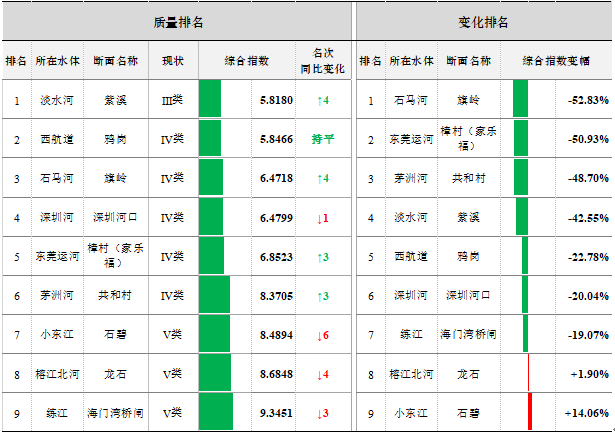 2020年1-10月,9个全面攻坚劣Ⅴ类国考断面中,水质综合指数排名前三位为淡水河紫溪、西航道鸦岗、石马河旗岭,后三位为练江海门湾桥闸、榕江北河龙石、小东江石碧。石马河旗岭、东莞运河樟村(家乐福)、茅洲河共和村等7个断面水质同比有所改善,小东江石碧、榕江北河龙石2个断面同比有所变差。