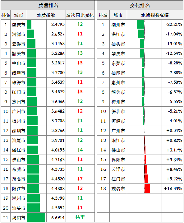 城市排名:149个国控断面中,城市水质指数排名前三位为肇庆、河源、云浮市,后三位为揭阳、汕头、潮州市。潮州、湛江、汕头等11市水环境质量同比有所改善,茂名、江门、云浮等7市同比有所下降(中山、清远、珠海3市所有国控断面均达到拟定水质目标且均达到或优于Ⅱ类,不参与水质变化排名)。