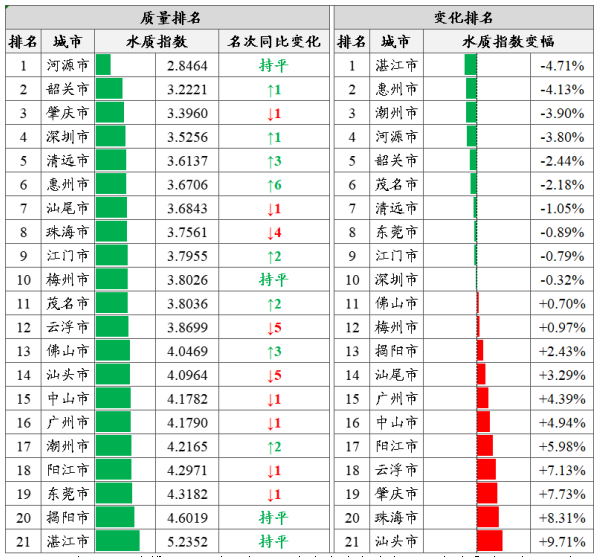 城市排名:基于270个省考断面水质监测结果,按照城市水质指数由低到高排名,全省水环境质量前三名为河源、韶关和肇庆市,后三名由高到低为湛江、揭阳和东莞市。湛江、惠州和潮州等10市水环境质量同比有所改善,珠海、汕头和肇庆等11市同比有所下降。