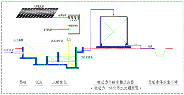 一种太阳能微动力农村生活污水一体化处理技术,其主要为一种太阳能微动力农村生活污水一体化处理装置,该装置包括微动力村镇污水处理装置以及用于给所述污水处理装置提供电能的供电装置。污水处理装置包括同心设置的厌氧反应区和好氧反应区,供电装置为太阳能电池板,太阳能电池板通过太阳能电缆与智能控制箱连接。与现有技术相比,该技术将厌氧反应区和好氧反应区设置在一体装置中,能减低装置的占地面积,实际应用过程中可根据进出水水质灵活设置若干组隔层,适用性广,污水处理效果稳定,且装置拆卸安装简单,检修维护方便;在好氧反应区利用重力自流原理,采用了污水溢流多级跌水的方式进行曝气,外围好氧反应区属于开放状态,经厌氧反应后的生活污水能够有效的与空气接触,减少了曝气装置与动力装置的使用,降低了能耗;此外,以太阳能电池板作为污水处理装置的供电装置,减少了运行维护费用。