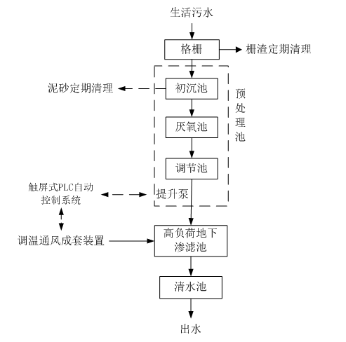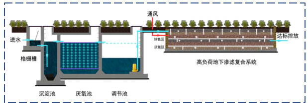 经过化粪池预处理的生活污水通过“高负荷地下渗滤系统”处理后,出水可达《城镇污水处理厂污染物排放标准》(GB18918-2002)一级排放标准。