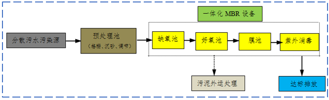 污水经过简易管渠及格栅后进入生化池,然后进入MBR膜生物反应池,膜组件置于生物反应器内部,污水进入膜-生物反应器,其中的大部分污染物被混合液中的活性污泥去除,再在负压作用下由膜过滤出水达标排放或中水回用。