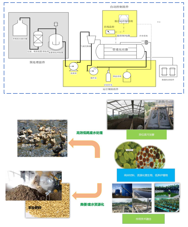 该技术通过建立物联网优化的微藻氧化塘废水回收营养资源技术,在自控的基础上优化微藻的培养,并结合跑道式氧化塘深度处理养殖废水氮磷元素;在研发高效脱氮除磷的纳米改性填料基础上,强化人工湿地对禽畜养殖污水的治理效果,提高对抗生素等微污染物的去除效率;开展异位粪便发酵自动化处理系统的研发,提供禽畜养殖前端处理及无害化的成套技术;最终通过粪便的异位发酵自动处理技术与物联网优化的废水技术建立养殖废水及粪污资源化技术体系。