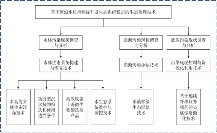 在点源污染得到基本控制的前提下,基于河湖水质持续提升及生态系统稳定的生态治理技术从面源污染控制、污染底泥控制与资源化、水生态系统修复等三个关键点切入,通过湖滨梯级生态湿地面源污染控制技术、基于连续纤维丝补强的污染底泥资源化利用、功能型沉水植物筛选和应用边界条件研究及应用、多功能立体生态浮岛产品开发、高效脱氮土著微生物筛选与产品开发及水生态修复后期维护等六大重点生态技术研究开发与集成,针对性地解决面源污染和水质提升问题,实现底泥污染控制与资源化,确保水体持续净化与提升,构建完善、稳定的水生态系统。