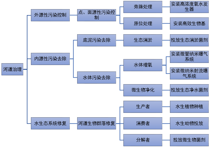 该技术通过增氧能够改善水底层缺氧,有利于增加生物的多样性,同时运用河道土著微生物与微生物复合菌群配伍,组成微生物菌剂,再配合生物基技术为微生物提供良好的生长环境,使微生物菌剂发挥作用,在消除淤泥的时候,也通过水生植物的光合过程以及随后的同化过程,逐步吸收消除无机氮形成各种含氮有机物;微生物菌剂同时大量吸收磷酸盐,合成自身的核酸并将过量吸收的磷合成储存于体内,通过水生植物和水生动物共同吸收、食用作用,达到去除氮、磷的目的,从而快速修复生态系统。