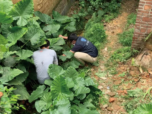 ▲执法人员沿河涌溯源,查找污染物排放源头