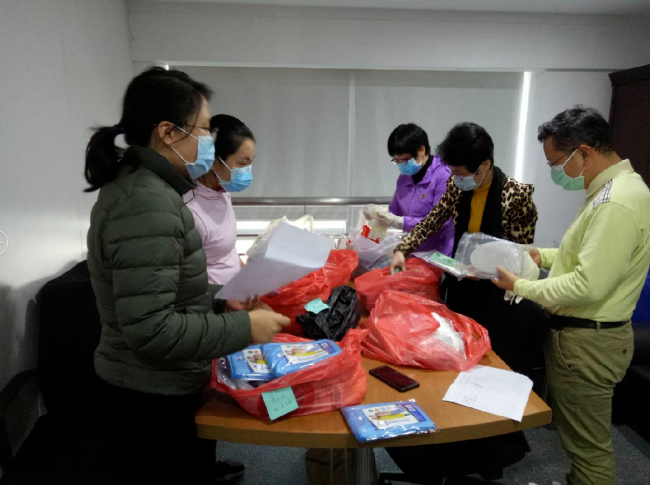 ▲疫情期间,李春平与机关党委的同事们一起为前线抗疫志愿者准备防护物资。