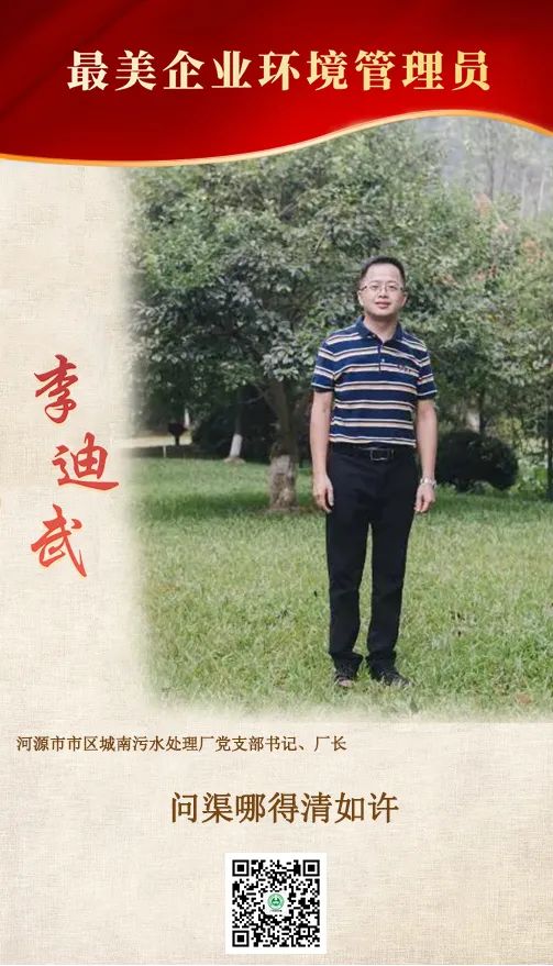 李迪武说,他的青春与时光都给了污水处理事业,在不断的策驽砺钝中,奋身前进。在他的带领下,市区城南污水处理厂从最开始的几人,渐渐壮大到如今的55人团队。他所管理的污水处理厂也成为了全省产业转移园中首座具有人工湿地深度处理工艺且率先投产的污水处理厂,被省经济和信息化委员会、省科学技术厅认定为“广东省清洁生产单位”,为打造生态河源和现代河源及高新技术开发区的进一步发展构筑了坚实的环保基础,同时为东江中下游城市4000万人口的饮用水安全提供了安全保障。