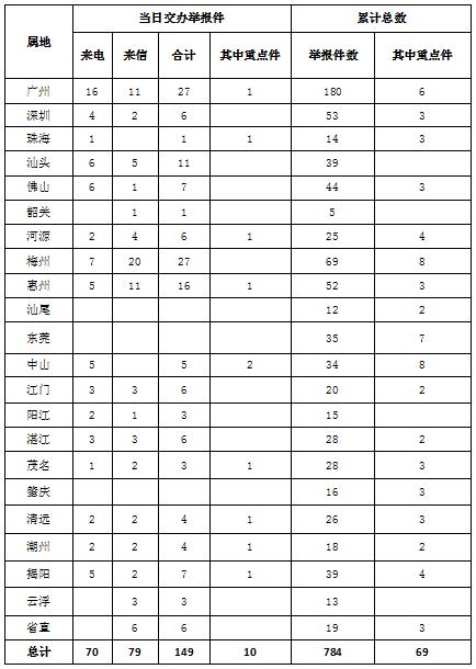 经分析,按污染类型分,水32件(占22.2%),大气57件(占39.6%),噪声35件(占24.3%),固废29件(占20.1%),土壤1件(占0.7%),生态破坏32件(占22.2%),海洋4件(占2.8%),农业农村8件(占5.6%),其他23件(占16.0%);按地域和单位分,涉及18个地级以上市和省委编办、省政府办公厅、省司法厅、省住房和城乡建设厅、新澳彩资料 、省自然资源厅6个省直部门;按数量排序分,由高至低分别是广州、梅州各27件,惠州16件,汕头11件,佛山、揭阳各7件,深圳、河源、江门、湛江各6件,中山5件,清远、潮州各4件,阳江、茂名、云浮各3件,珠海、韶关各1件,省委编办、省政府办公厅、省司法厅、省住房和城乡建设厅、新澳彩资料 、省自然资源厅各1件。截至9月4日,中央督察组交办举报案件8批共761件(来电471件,来信290件),其中列为重点关注案件共64件;交办督办案件共1件。