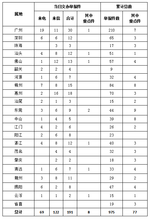 9月5日,中央第四生态环境保护督察组交办第9批涉及环境领域群众举报案件190件(来电68件,来信122件),其中列为重点关注案件8件(东莞2件,广州、汕头、佛山、湛江、清远、云浮各1件)。