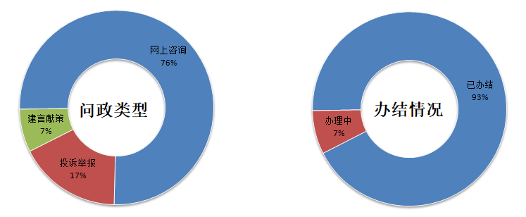 (三)进一步完善网络问政。2017年,广东环保公众网共受理1847件网络问政案件,其中投诉举报317件(直接向“生态环境网络投诉举报平台”投诉的案件未统计在内)、咨询1398件、建言献策132件。受理的办件已办结1713件,尚有134件在办理中,办结率为93%。共收到公众评论762条。广东环保公众网接受的网络问政办件,除问政人选择不公开外,问题及答复均在网站主动公开。