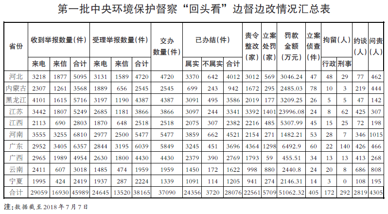 截至7月7日,督察组交办的群众举报生态环境问题,地方已办结28076件。其中,责令整改22561家;立案处罚5709家,罚款51062万元;立案侦查405件,行政和刑事拘留464人;约谈2819人,问责4305人。从各被督察地方报送情况看,河南省边督边改问责达到1015人,广东省拘留环境违法人员162人,江苏省处罚金额近2.4亿元。