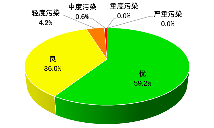2016年第二季度全省各城市空气质量达标天数比例平均为95.2%,其中,优占59.2%,良占36.0%;超标天数比例为4.8%,其中轻度污染占4.2%,中度污染占0.6%,无重度污染与严重污染。