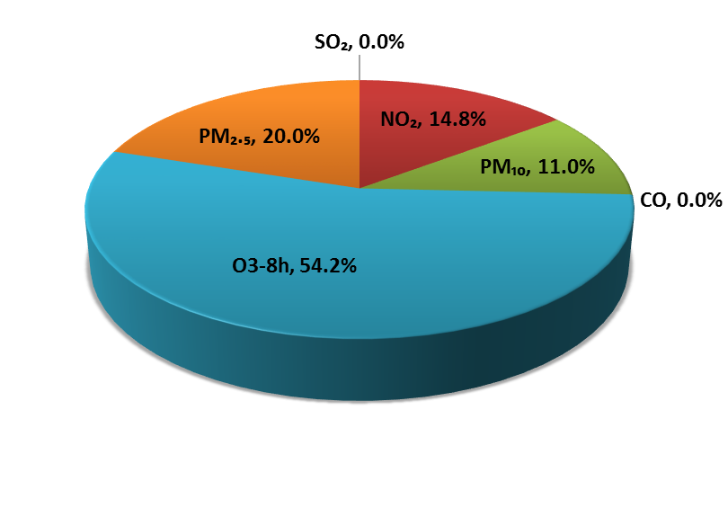 2016年第二季度全省城市主要空气污染物为臭氧日最大8小时均值(O3-8h),其作为每日首要污染物的比例为54.2%,其次为细颗粒物(PM2.5),占比为20.0%,二氧化氮(NO2)和可吸入颗粒物(PM10)作为首要污染物的比例分别为14.8%和11.0%。珠三角地区O3-8h作为首要污染物的比例为56.1%,NO2、PM2.5和 PM10作为首要污染物的比例分别为26.0%、11.9%和6.1%。珠三角以外地区O3-8h作为首要污染物的比例为52.5%,PM2.5、PM10和NO2 作为首要污染物的比例分别为27.7%、15.6%和4.3%。