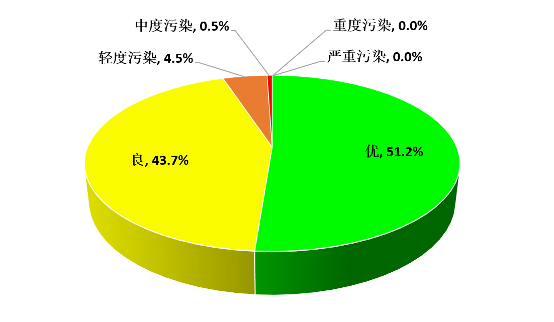 2016年上半年全省各城市空气质量达标天数比例平均为94.9%,其中,优占51.2%,良占43.7%;超标天数比例为5.1%,其中轻度污染占4.5%,中度污染占0.5%,无重度污染与严重污染。