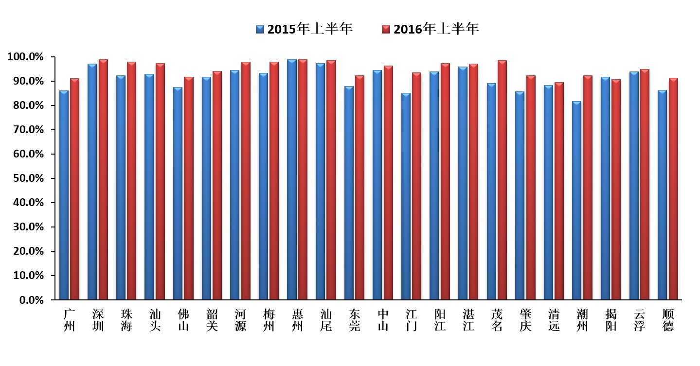 2016年上半年与去年同期相比,全省城市空气质量达标天数比例平均为94.9%,较去年同期上升3.8个百分点。珠三角城市空气质量达标天数比例平均为94.4%,较去年同期上升4.3个百分点。