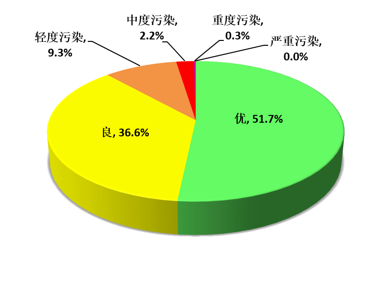 2016年第三季度全省各城市空气质量达标天数比例平均为88.4%,其中,优占51.7%,良占36.6%;超标天数比例为11.7%,其中轻度污染占9.3%,中度污染占2.2%,重度污染0.3%,无严重污染。