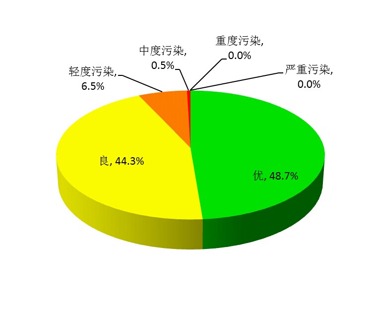 2014年第二季度全省各城市空气质量达标天数比例平均为93.0%,其中优占48.7%,良占44.3%;超标天数比例为7.0%,其中轻度污染占6.5%,中度污染占0.5%,无重度污染和严重污染。
