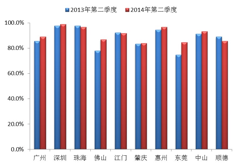 2014年第二季度与去年同期相比,珠三角城市空气质量达标天数比例平均为90.8%,较去年同期上升2.3个百分点,其中7个城市略有上升,升幅为0.4-9.9个百分点;珠海、江门和顺德3市(区)空气质量达标天数比例有所下降,其中降幅最大为顺德3.3%