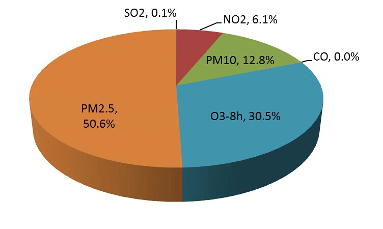 2014年第四季度全省城市主要空气污染物为细颗粒物(PM2.5),其作为每日首要污染物的比例为50.6%,其次为臭氧日最大8小时均值(O3-8h),占比为30.5%,可吸入颗粒物(PM10)和二氧化氮(NO2)作为首要污染物的比例分别为12.8%和6.1%。珠三角地区PM2.5作为首要污染物的比例为52.9%,O3-8h、PM10和NO2作为首要污染物的比例分别为30.5%、12.8%和6.1%。珠三角以外地区PM2.5作为首要污染物的比例为53.1%,O3-8h 和PM10作为首要污染物的比例分别为35.9%和16.8%。
