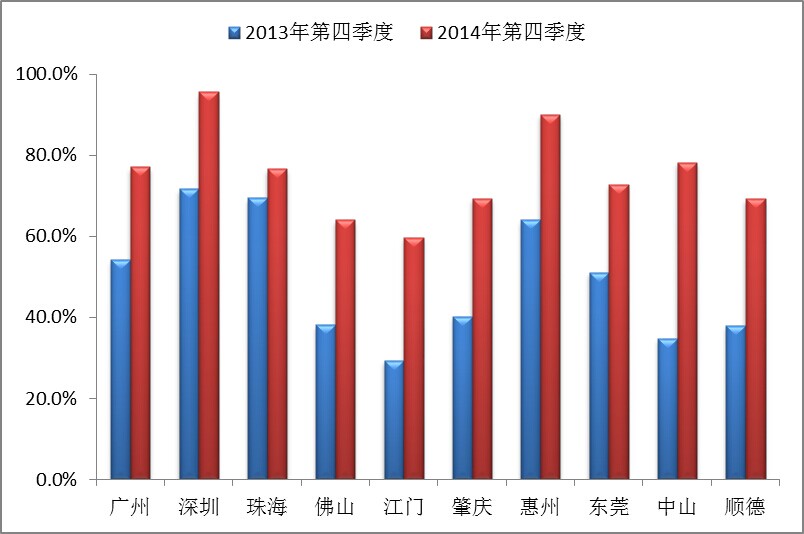 图3 2014年第四季度珠三角城市空气质量达标天数比例同比