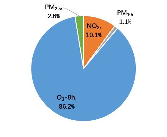 20177月全省城市主要空气污染物为臭氧日最大8小时均值(O3-8h),其作为每日首要污染物的比例为86.2%,其次为二氧化氮(NO2),占比为10.1%,细颗粒物(PM2.5)和可吸入颗粒物(PM10)作为首要污染物的比例分别为2.6%1.1%。珠三角地区O3-8h作为首要污染物的比例为83.1%NO2PM2.5作为首要污染物的比例分别15.7%1.1%