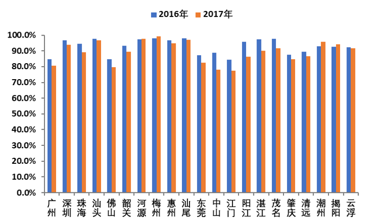 2017年与去年相比,全省城市空气质量达标天数比例平均为89.4%,较去年下降3.3个百分点。珠三角城市空气质量达标天数比例平均为84.5%,较去年下降5.0个百分点。
