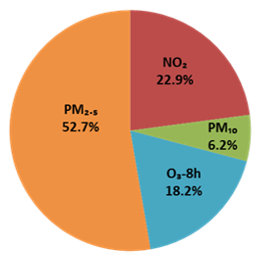 2018年1月全省城市主要空气污染物为细颗粒物(PM2.5),其作为每日首要污染物的比例为52.7%,其次为二氧化氮(NO2), 占比为22.9%,臭氧日最大8小时均值(O3-8h)和可吸入颗粒物(PM10)作为首要污染物的比例分别为18.2%和6.2%。珠三角地区PM2.5作为首要污染物的比例为47.5%,其次为NO2(占比40.4%),O3-8h和PM10作为首要污染物的比例分别7.2%和4.9%。