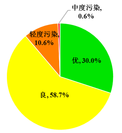 2018年4月全省各城市空气质量达标天数比例平均为88.7%,其中,优占30.0%,良占58.7%;超标天数比例为11.2%,其中轻度污染占10.6%,中度污染占0.6%,无重度污染和严重污染。珠三角地区空气质量达标天数比例平均为91.1%。