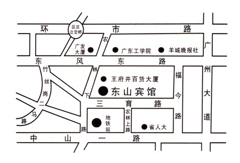 东山宾馆位于广州市中心,距火车东站仅6Km,由火车东站或乘283、41、551、185路至东风东路(羊城晚报站)或由火车站乘30、225路至农林下路。乘地铁至东山口站下地铁、从C出站口出来、出来地面之后沿农林下路向右行500米,看见广州王府井百货大门再向右行60米就可以到达东山宾馆大门口。