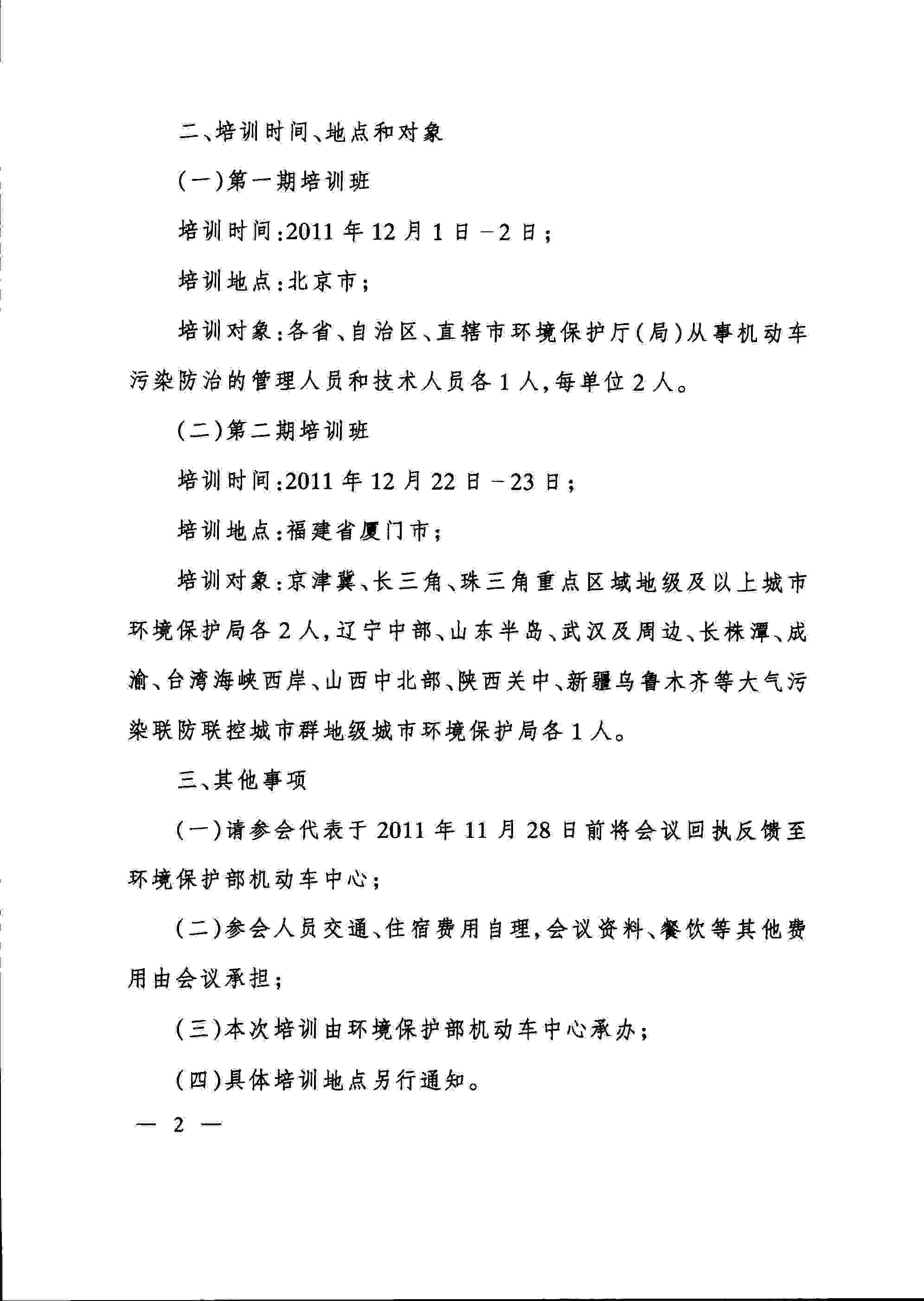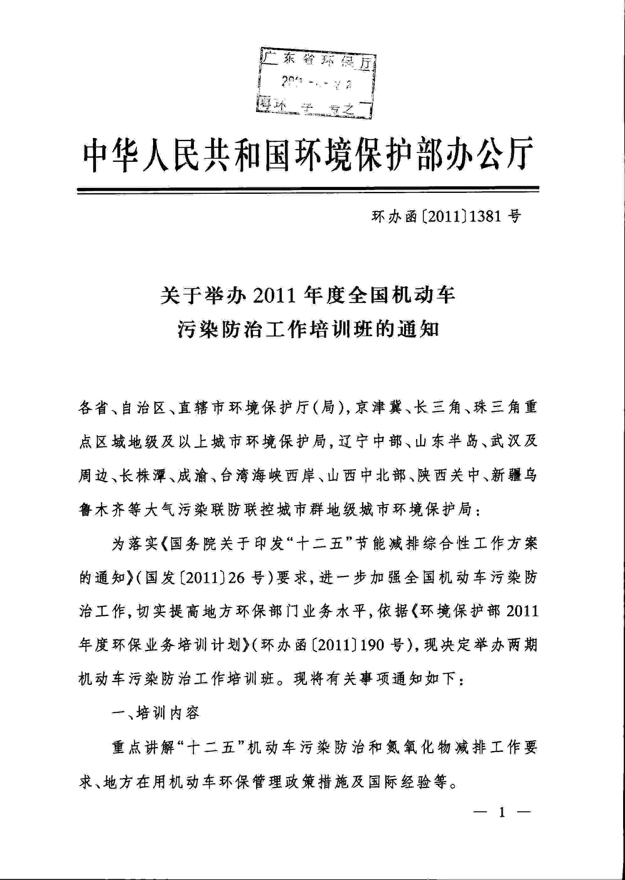 现将环境保护部办公厅《关于举办2011年度全国机动车污染防治工作培训班的通知》(环办函〔2011〕1381号)转发给你们,请按要求报名参加。