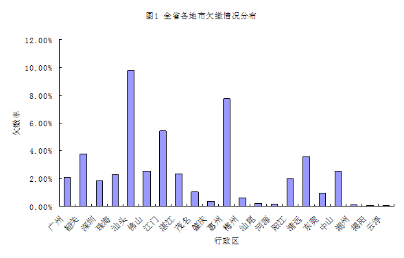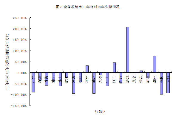 2009年末,我厅要求全省各地市分阶段完成追缴、催缴任务,努力实现“一年一个目标,一年一个突破”,欠缴率限值从2009年的10%逐步过渡到2010年的7%,直至2011年4%,逐步实现一年下降3.0个百分点的目标。三年来,全省各级环保部门,不断加大催缴力度,更新催缴模式,有效改善全省欠缴情况。据统计,2011年全省欠缴金额2786.9万元,相对2010年减少3039.1万元;欠缴率为2.9%,相对2010年降低3.3个百分点。全省21个地级市,除汕头、江门、惠州之外(该三市欠缴率低于10%),其余18个地级市欠缴率均低于4%(如图1所示)。全省各地市2011年相对2010年欠缴情况,除湛江、潮州、江门、惠州、肇庆等地市由于2010年欠缴金额本底值较低,欠缴金额2011年略有增长之外,其余16地市2011年欠缴金额相对2010年均有大幅下降,其中广州、佛山、河源、汕尾、中山、云浮、揭阳等地市均下降60%以上(如图2所示)。