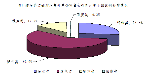 2011年度全省排污费开单金额95086.0万元,其中污水类25159.2万元,占总开单金额的26.5%;废气类56141.5万元,占总开单金额的59.0%;噪声类12051.5万元,占总开单金额的12.7%;固废类145.2万元,占总开单金额的0.2%。(见图1)