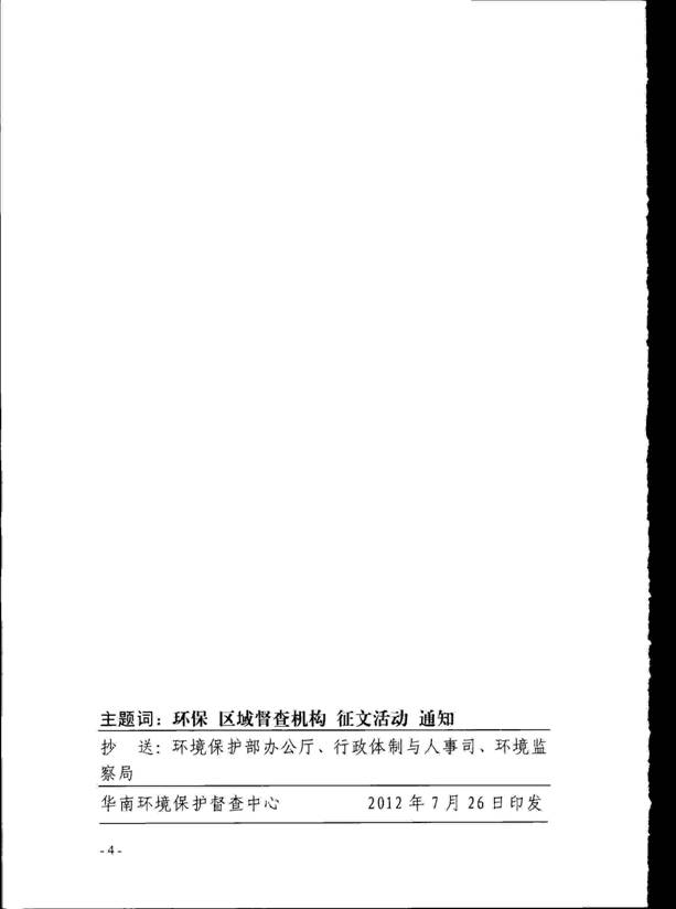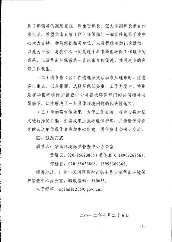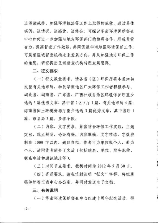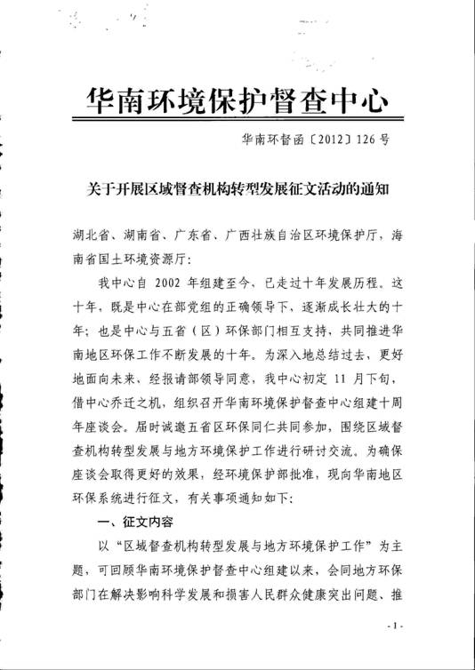 现将华南环境保护督查中心《关于开展区域督查机构转型发展征文活动的通知》(华南环督函〔2012〕126号)转发给你们,请各单位结合工作实际和附件的相关要求,组织报送不少于1篇优秀征文,请将纸质稿件和电子件于9月20日前报送至我厅环监局,并注明联系人和联系方式。
