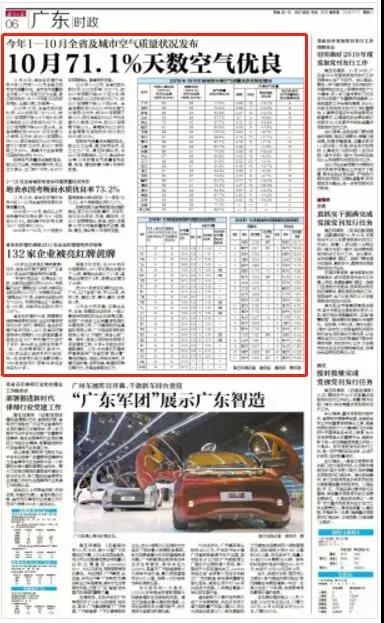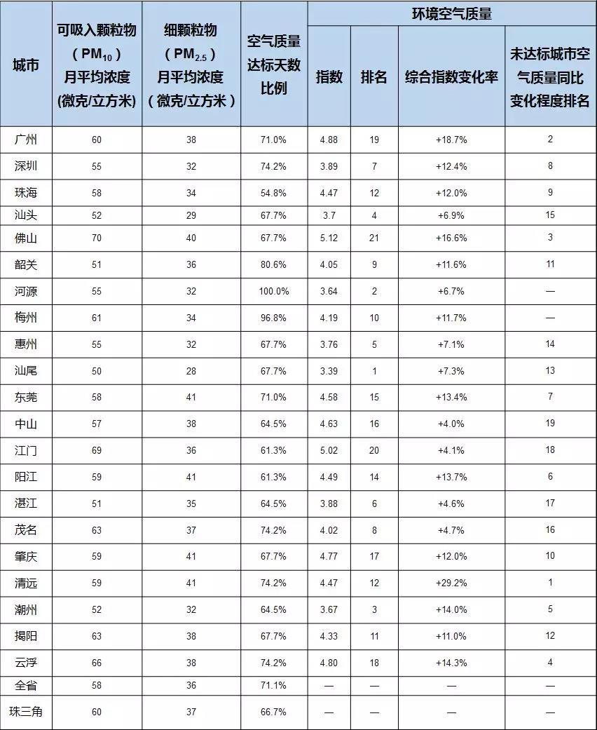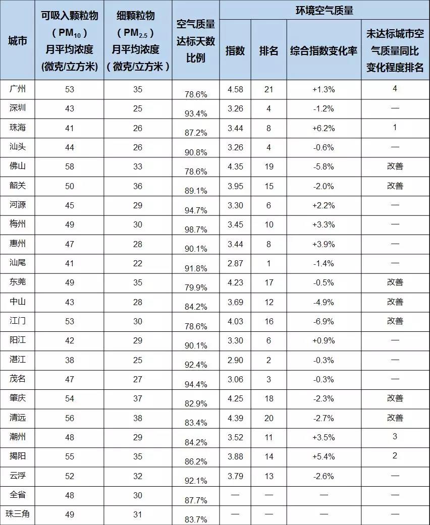 2018年1-10月,全省优良天数比例(AQI达标率)为87.7%,较2017年同期下降2.2个百分点;珠三角地区AQI达标率为83.7%,较2017年同期下降1.3个百分点。全省细颗粒物(PM2.5)平均浓度为30微克/立方米,较2017年同期下降3.2%;珠三角地区PM2.5平均浓度为31微克/立方米,较2017年同期下降3.1%。臭氧和PM2.5作为全省首要污染物的比例分别为65.5%和19.3%。按照空气质量综合指数排名,前三位为汕尾、湛江和茂名市,后三位为广州、清远和佛山市;与2017年同期相比,江门、佛山和中山等13市环境空气质量有所改善,珠海、揭阳和惠州等8市有所变差。