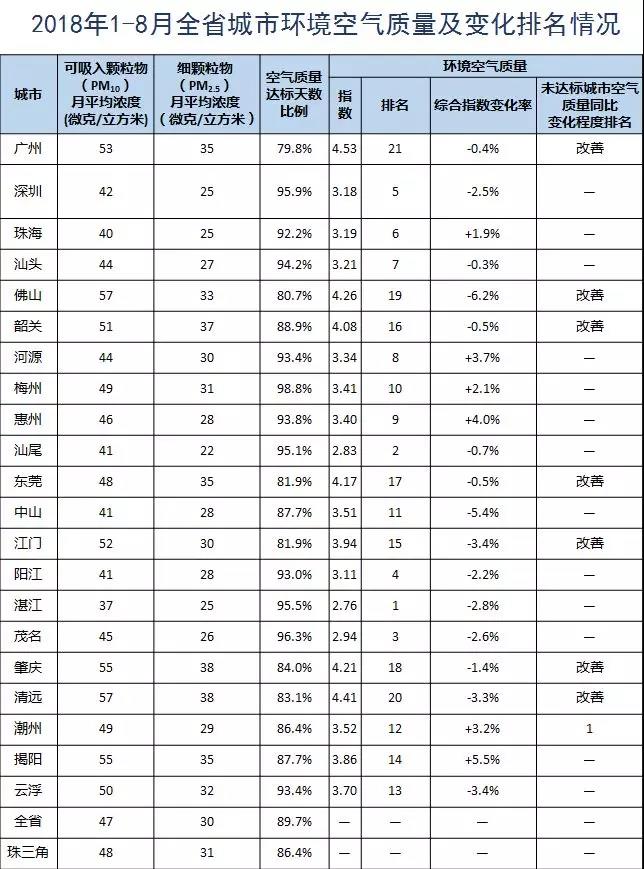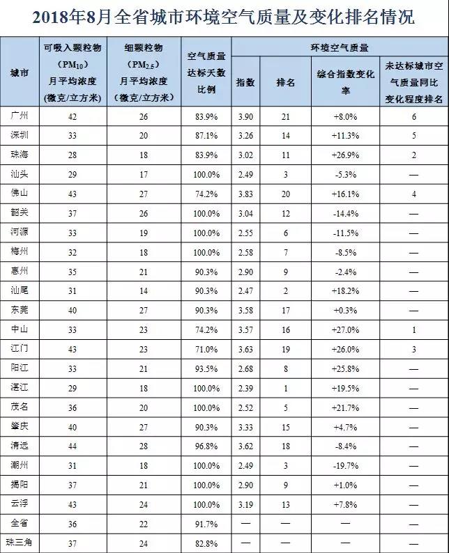 按照空气质量综合指数排名,前三位为湛江、汕尾和茂名市,后三位为广州、清远和佛山市;与2017年同期相比,佛山、中山和江门等15市环境空气质量有所改善,揭阳、惠州和河源等6市有所变差。