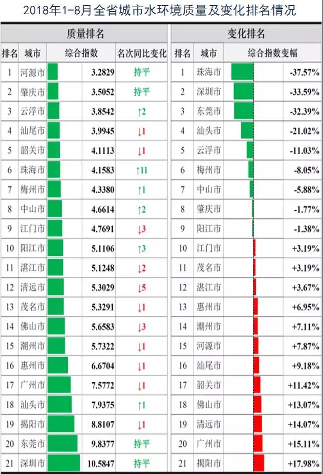 按照地表水省考断面综合指数排名,前三位为河源、肇庆、云浮市,后三位为深圳、东莞、揭阳市,与2017年同期相比,珠海、深圳、东莞等9市水环境质量有所改善,揭阳、广州、清远等12市有所变差。